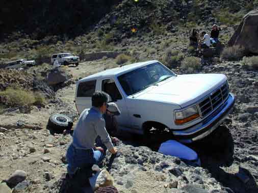 Mean while, Brett in his Bronco slashed a tire in a difficult location. He only had a small spare tire. Prior to this the other Bronco on the trip got stuck, and it took a while to get free. After an hour or so latter, Brett got the smaller tire on the truck, and with some careful driving, turned his truck around on the tight trail.Terry and a group of others walked on the find the elusive fish canyon grave site. It was not to be found even with Roger's GPS coordinate.