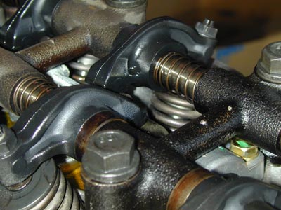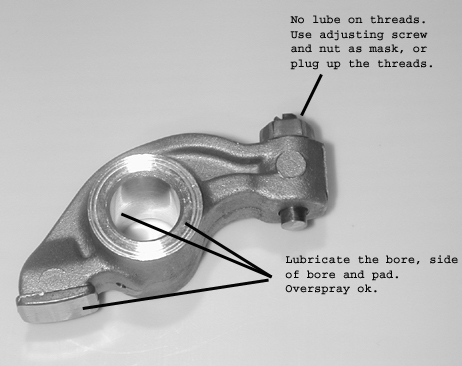 The right picture shows the rocker arm with the black coating of dry film lube on it. The dry film works great for the bore of the rocker arm, but it tend to wear away quickly at the pad.