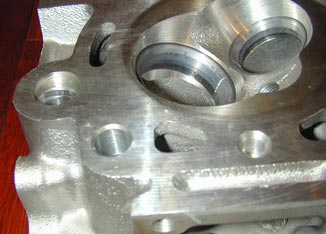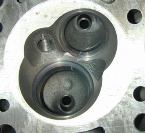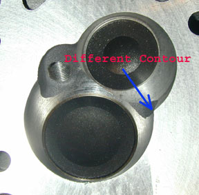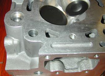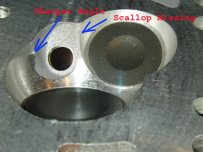 Shape of the chamber opposite side of the sparkplug is also different. There is a sharper angle on the contour that tend more to isolate the two valves more. The OEM one has a deeper scallop to allow gas to move across the combustion chamber. However, I don't claim to have any knowledge of combustion chamber design. Guess is that the OEM one is better performance since it seems to allow better flow into the cylinder. There are other factor in performance of the chamber like how well the gas mix inside the chamber. The more turbulance the better for mixing of fuel with air. Sharper angles may achieve better turbulance. The finish on the OEM combustion chamber is surprisingly rough. The engnbldr head is better finished in this area.