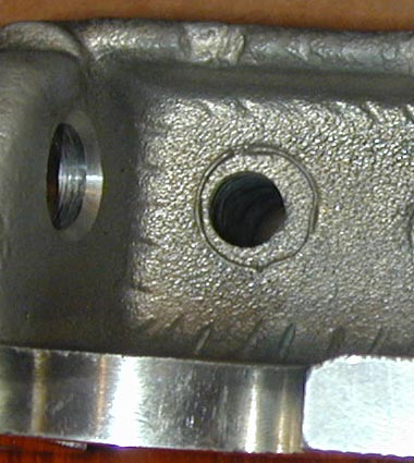 Here is the oiling hole for the cam bearing. Both holes are the same size. However, the OEM hole has a chamfer around the hole. The engnbldr head does not. The chamfer is probably better for oiling. It would not be a bad idea to round off the edge of the hole with a deburring tool before installing the camshaft. It would help to spread the oil onto the bearing. Just don't over do it. The bottom of the bearing is where all the loads are, and oil pressure there is very high. You don't want the oil hole to extend to the bottom of the bearing. Otherwise, high pressure oil film would reverse oil flow back into the oil pump, and you have metal to metal contact. At least that is how it is theoretically.