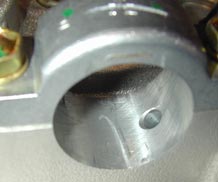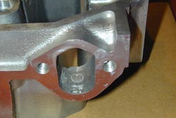 The engnbldr hole for the distributor mount seems to be out of alignment and too high on the cylinder head. Upon closer measurement, then are actually in the same position and angle. It is an optical illusion because the boss for the distrubutor is actually bigger in the lower direction than is necessary. The larger chamfer on the distrubutor opening is larger in the engnbldr head, so it looks like is closer to the top of the head. In reality, is in the same position. No issue here. You can also see that the top edges of the cylinder head is not deburred as on the OEM head. Functionally, they are the same.