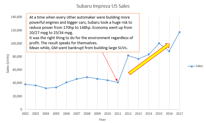 Many analyst thinks Subaru and Mazda will go the way of Saab, Isuzu, Suzuki and other small car companies in the US. Subaru has made cars that makes sense with safety, economy, visibility in mind regardless of current styling trend. Subaru has boldly kept their large window size. Subaru has always been know to be strong in a roll over crash despite their large windows and thin pillars. Racers has know that. On youtube, a WRX did a high speed multiple roll with the roof fully intact. In another car the roof would have been completely crushed. Other manufactures said they cannot make a strong roof with thin pillars. Subaru did it. On a second note, for their 4th generation Impreza, the reduced the engine size from 2.5l to 2.0l back in 2011, decreasing hp from 170hp to 148hp. Gas mileage went from 20-27mpg to 25-34mpg. Mileage was nheard of at the time for an AWD. They were the first manufacture to actually reduce engine power for fuel economy. Remember this was the time when bigger was better. So what was the result of Subaru building a car that makes sense. Obviously enough of the public noticed. They have just set their 5th consecutive yearly sales record. Their problem now is they can't keep up with demands.