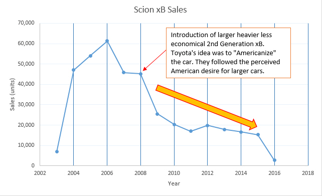 Then came 2008 redesign. Scion made it larger, bigger engine and smaller window. The critical rear quarter visibility is now horrible. Larger heavier car requires a bigger less economical engine. Everything that made the original xB practical and cool is now gone. So what happened to sales? After 2008, the xB sales took a nose dive. Nobody talked about the xB anymore. In fact, the xB was the car that defined the Scion brand. In an effort to make it appeal to a focus group consumer, they made a car that is no longer unique, and was just like any other cars that has poor visibility, over weight, large and uneconomical. The new xB started to look like the Chevrolet HHR, which is similar to the infamous, would not be caught dead in it, PT Cruiser.