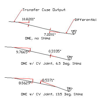 Just by bolting the OME springs on and do nothing, the front u-joint angle would be 10.5 degree and the rear would be 6.9 degree. This is a problem because with torque at the wheel, the rear angle would be 6.9 degree - 3 degree(reaction due to torque load) = 3.9 degree. 10.5 degree in front and 3.9 degree is not good. That is a 6.6 degrees difference in bent of the u-joints. This is too much. Some noticable fault is when lifting the gas pedel going downhill at about 75 to 80mph there is some loud gear noise. There is gear-wining noise at all slow speeds. If this were a weekend play truck, this would be all right. As a daily driver, this noise is not acceptable. There is too much stress on the drivetrain. These gear noise and whine gets irritating in a long drive. I would not go over 65mph because of the noise.