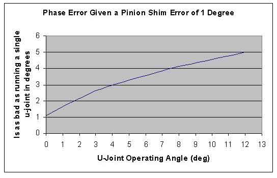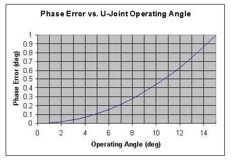 The below graph shows how much phase error a u-joint have given its operating angle. The phase error is the amount that the output end of the u-joint speed up as the joint is rotated 45 deg. At 90 deg. the u-joint is again in phase. As seen, the higher the operating angle of the u-joint, the higher the phase error. Note that the graph does not lie in a straight line (linear), but rather, is curved upward. This means, the higher the operating angle of the u-joint, the much more error you have. You can deduce that at higher angles, if you make an error in shimming the pinion, you would have more phase error than at lower driveshaft angles.
