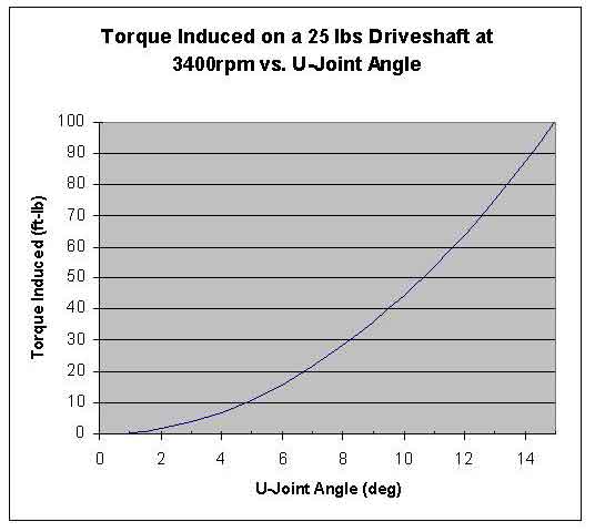 The graph assumes the center tube of the driveshaft weights 25 lbs. Is spinning at 3400 rpm. The shaft diameter is 3", and thickness of the shaft is .1" You can see that if the u-joint is running at 14 degrees, the induced torque would be close to 100 ft-lbs. That is as much torque as the engine puts out. I would not be comfortable with that figure. My limit would be around 6 degrees. Evidently, this is what experianced people recommend with seat of the pants estimation.