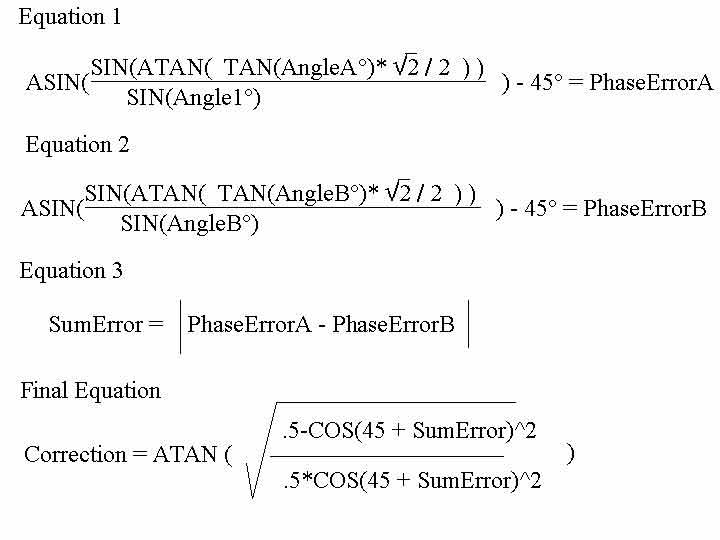 Equation 1 and 2 plug in "AngleA" and "AngleB" into the equation. Calculate "PhaseErrorA" and "PhaseErrorB". Remember, if you are using Excel, you have to convert angles to radians since that is how excel or some calculators calculates. 180 degrees is 3.1415 radians.