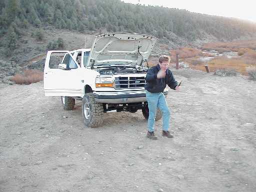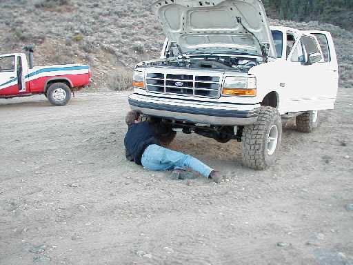 The Bronco has an infamous weak tie-rod. The larger tires made it worst. Some where along the trail, the rod was slightly bent. Brett turned the rod end to do an informal alignment by eye. It worked quite well.