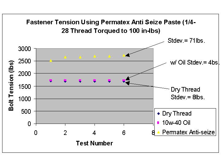 I calculated the standard deviation for the results above. Standard deviation is a mesurement of how consistent you could achieve the results. The number indicate you have a 68% confidence that the next time you test, the standard deviation is the maximum that the result will vary by. The smaller the standard deviation the better. With anti seize, it was 71lbs. This is much higher than with dry thread, at 8 lbs. or with 10w-40, at 4 lbs.oil on thread. Therefore, putting 10w-40 oil on the thread gave the most consistent results without any significant increase in tension. A word of caution here is don't use these data as a correction factor for reducing torque on a fastener that has anti-seize applied to it. These tests are performed with the nut sitting on a ball bearing, so that part of the friction is not accounted for. However, the test is good for comparision purpose between different types of lubricant.