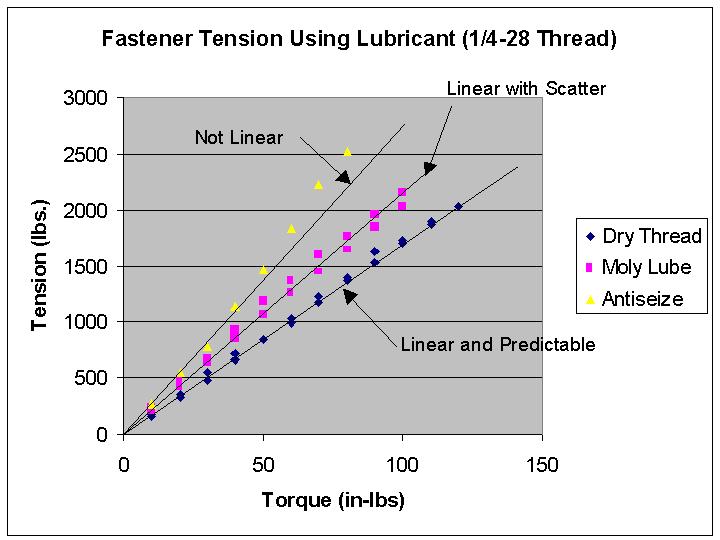 A strain gauge was placed on a 1/4-28 bolt and torqued with a torque wrench to various values. The strain gauge could then read the amount of force on the bolt. Alternately, dry threads, threads smeared with moly paste, threads dipped in 10w-40 oil and threads with anti-seize compound applied to it was tested.