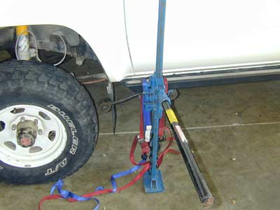 In classic shade tree mechanic style, I used the hyjack along with tie downs on the rocksliders to bend the torque tube. Despite the tremendous load placed on the rockslider with me standing on the hyjack lever, they held up nicely. Hardly any scratched paint.