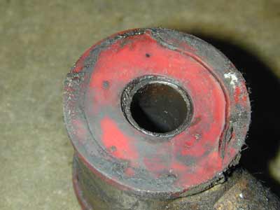 2. The tubing in the center of the bushing was too short by maybe .1" Rancho must be too cheap to cut a longer piece of tubing, or they don't know how to measure. This cause the ears of the mounting tabs on the frame to bend inward, and deform the poly bushing. The bent tabs also mean that the tabs are not seated flat agains the tubing. Without a good seating surface, the tubing can move and twist around within its clearance.