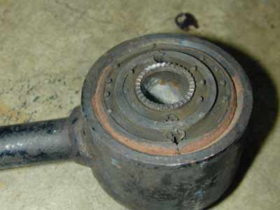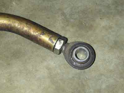 The other end on the Rancho torque tube. The threaded rod end is a good idea with some limtations. The amount of swivel on the ball is limited to about 13 degrees before interference with the supplied spacer. Once length adjustment is set, the lock nut is tightened. However, the locking nut on the rod end will never have enough tension to prevent the rod end from turning once angular travel on the rod end is used up. This may not be a problem for most rigs, but for suspensions with lots of articulation, the rod end will loosen. This is the same reason I would not modify the stock torque rod into an adjustable one with a stud and two nuts. The twisting torque from articulation of the suspension will loosen the lock nuts. The nuts cannot loosen all the way since the rod can turn only so much. However, now the threads will be another wear point on the suspension. Something it is not designed for.