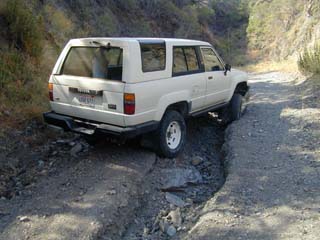 At the top of the difficult part, there is a deep rut on the right hand side of the trail. I had to pass by on the left side near the bush. The rut on the right side is deep enough to cause possibly tipping. The solid axel Toyota is narrower than the 86' and latter models. My truck has the stock steel rims without offset to widen the truck. That along with the 2.5" lift makes off camber trails scary.