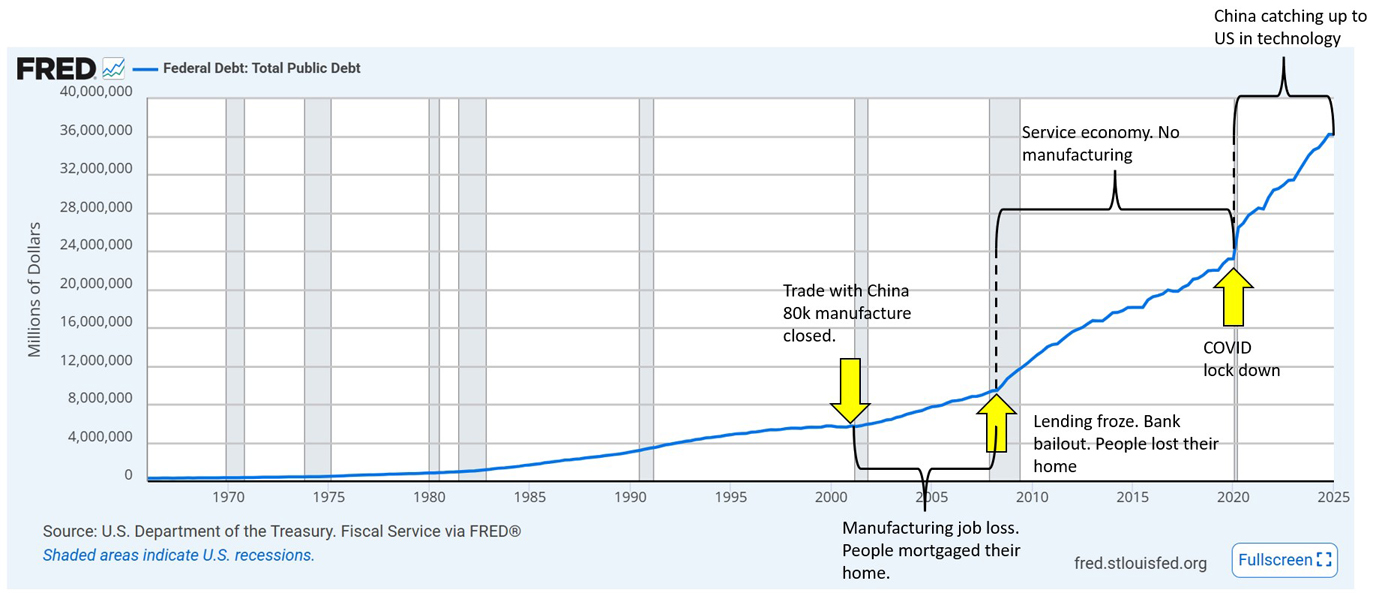 As of this writing (6/2025), the debt is 36 trillion. It is unsustainable. Elon tried to cut government spending. But government stimulation of the economy is the bloodline for many people because they don't have a good paying job to begin with. There was a big blowback. A group of people started keying Teslas. Tim Waltz called for Tesla to go down, and asked people to take off the emblem to fix their problematic car. Tesla sales tanked, and stock went down. Nobody on Democrat side condemned the action. It was a bad display of democracy. People feared spending cuts. Government has no choice but to continue to spend to stimulate the economy. Trump wants to impose tariff on Chinese imports. People already don't have good income. We already had a huge inflation in 2022 while wage did not go up. If cost of product goes up even more, many will be underwater. In the long run, tariff would inevitably bring back some manufacturing. However, tarrif has to be stable and long term. No company would invest millions in a manufacturing plant if tariff changes with politics.