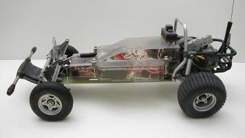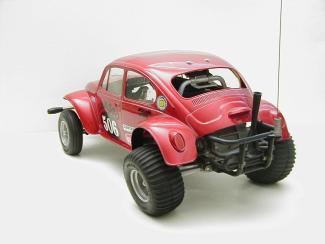 The side is the most attractive view of the model. The outdated style of the VW body even by then standard is quite a contrast to the sophisticated mechanisms in the kit. The highly lifted vehicle with long suspension travel can be clearly seen by the amount of space between the tires and the wheel well. Under full compression, the wheels will travel high enough to rub the fenders a little at the top. |